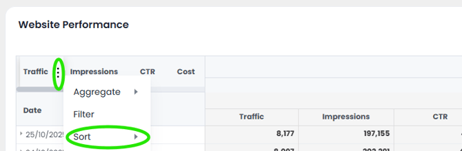 - If you are in a Pivot Table view then click the three dots next to the column title and select Sort