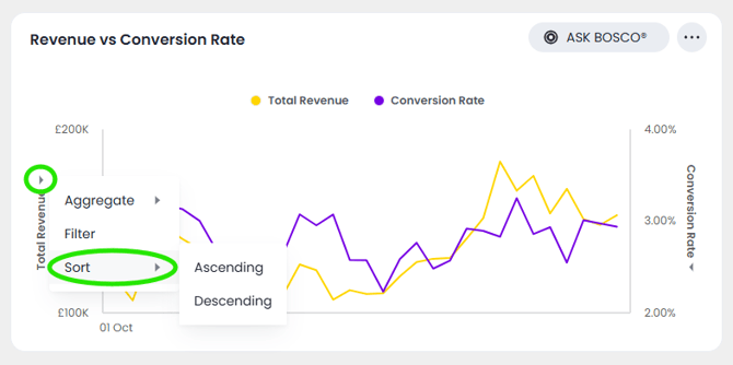 - If you are in the chart view, click the axis label of your chart that you would like to sort and select Sort. You can choose to sort in ascending or descending order.