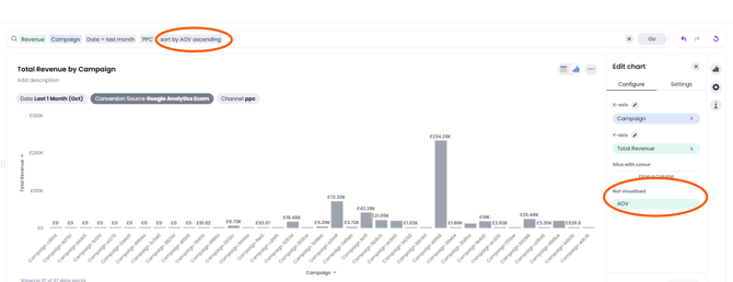 You can also sort by a measure that you do not want to include in the chart. For example, if you add search tokens for Campaign and sort by AOV, you can move AOV to the "Not visualized" section from the Edit chart panel.