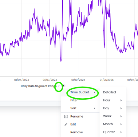 To bucket your data in a chart view, open the dropdown icon that appears when you hover near the axis labels on a chart.