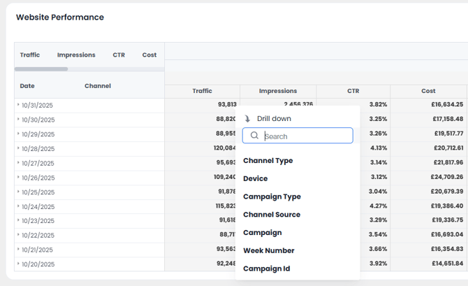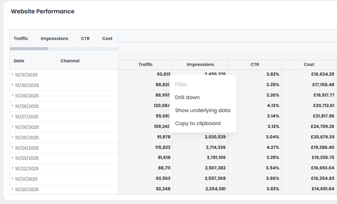 Drilling down lets you explore what’s behind a specific data point in a chart. For example, you might start with a high-level view of total sales by region, then drill into one region to see when sales were highest or which product categories drove performance.